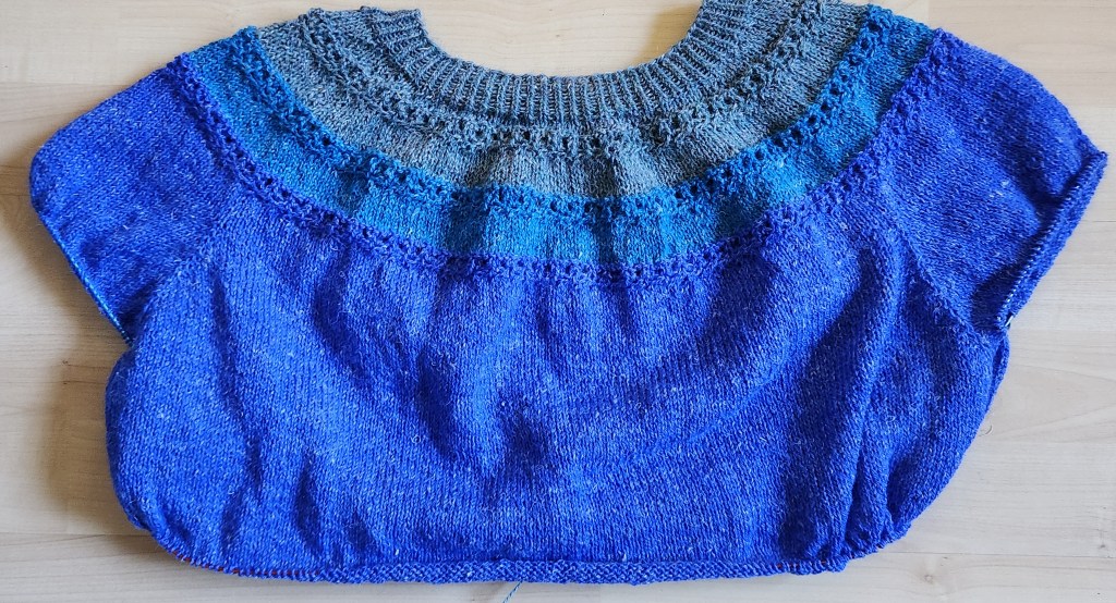 It’s a lovely, well-written pattern (linked in caption), and my version will have a mix of blues in stripes due to using the three skeins I had on hand from a massive sale a few years ago. Once it’s finished, I hope to make a new one with different wool-cotton blend.